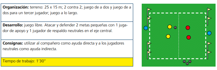 Cualidad física: Potencia aerobia (VAM) 2 contra 2, sin portero, con jugadores de apoyo y/o respaldo en el eje central Ofensivo: atacar dos pequeñas metas Defensivo: defender 2 metas pequeñas