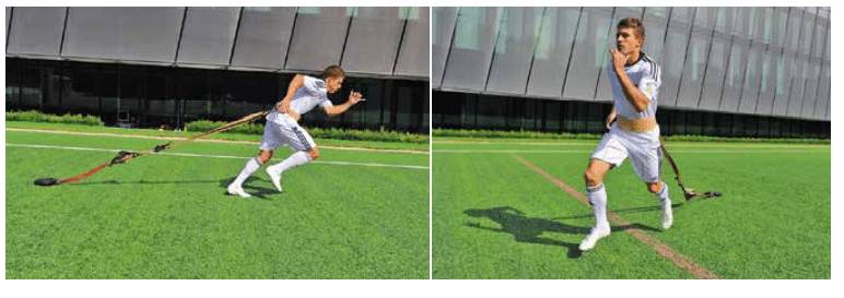 Ejemplo II: musculación con trineo combinada con la situación de 2 contra 2; juego con efectivos reducidos. Carrera sobre 15 m con trineo; 15 m de regreso marcha; 15 m de carrera hacia atrás; 15 m de carrera con trineo x 2; recu[1]peración 1’30’’