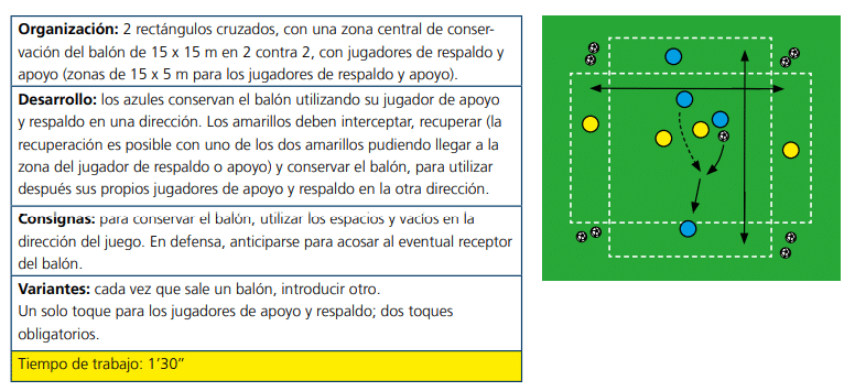 Cualidad física: velocidad y aceleraciones sobre fondo de PAM 2 contra 2, sin portero, + jugadores de apoyo y respaldo Ofensivo: conservar el balón entre los jugadores de apoyo y respaldo Defensivo: interceptar y recuperar el balón