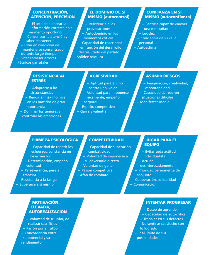 Ser resoluto, asumir riesgos, manifestar agresividad y ser solidario en el juego o, por lo contrario, dejarse desmotivar tras cada duelo perdido, carecer de voluntad, dudar de sí mismo, tener miedo de rematar a la meta contraria y la falta de concentración son todas actitudes mentales que se constatan en los jugadores durante un partido o una sesión de entrenamiento. Las actividades mentales negativas tienen por consecuencia una disminución del rendimiento, así como una aminoración en el aprendizaje y en la evolución de los jugadores. Los futbolistas de categoría se diferencian de los jugadores mediocres por un mejor manejo de sus capacidades mentales. La fuerza mental, con sus diferentes factores, es una de las piezas decisivas del talento y rendimiento del jugador